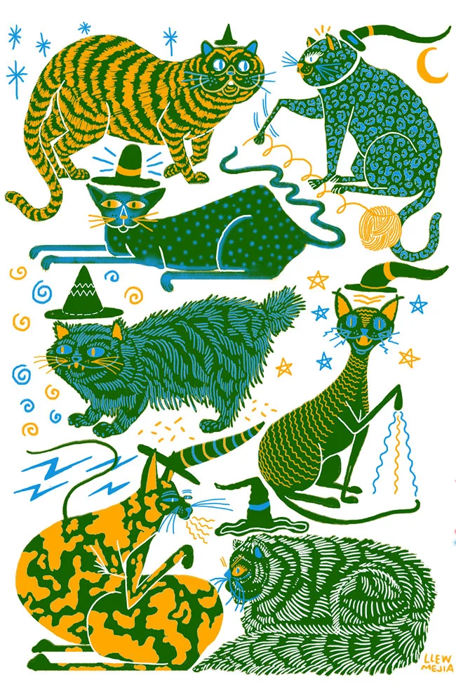 Cats were prosecuted almost as much as witches during the middle ages in Europe. People assumed that cats were witches familiars or demon accomplices in mischief. We all know that simply is not true and cats are the best. I illustrated various breeds!